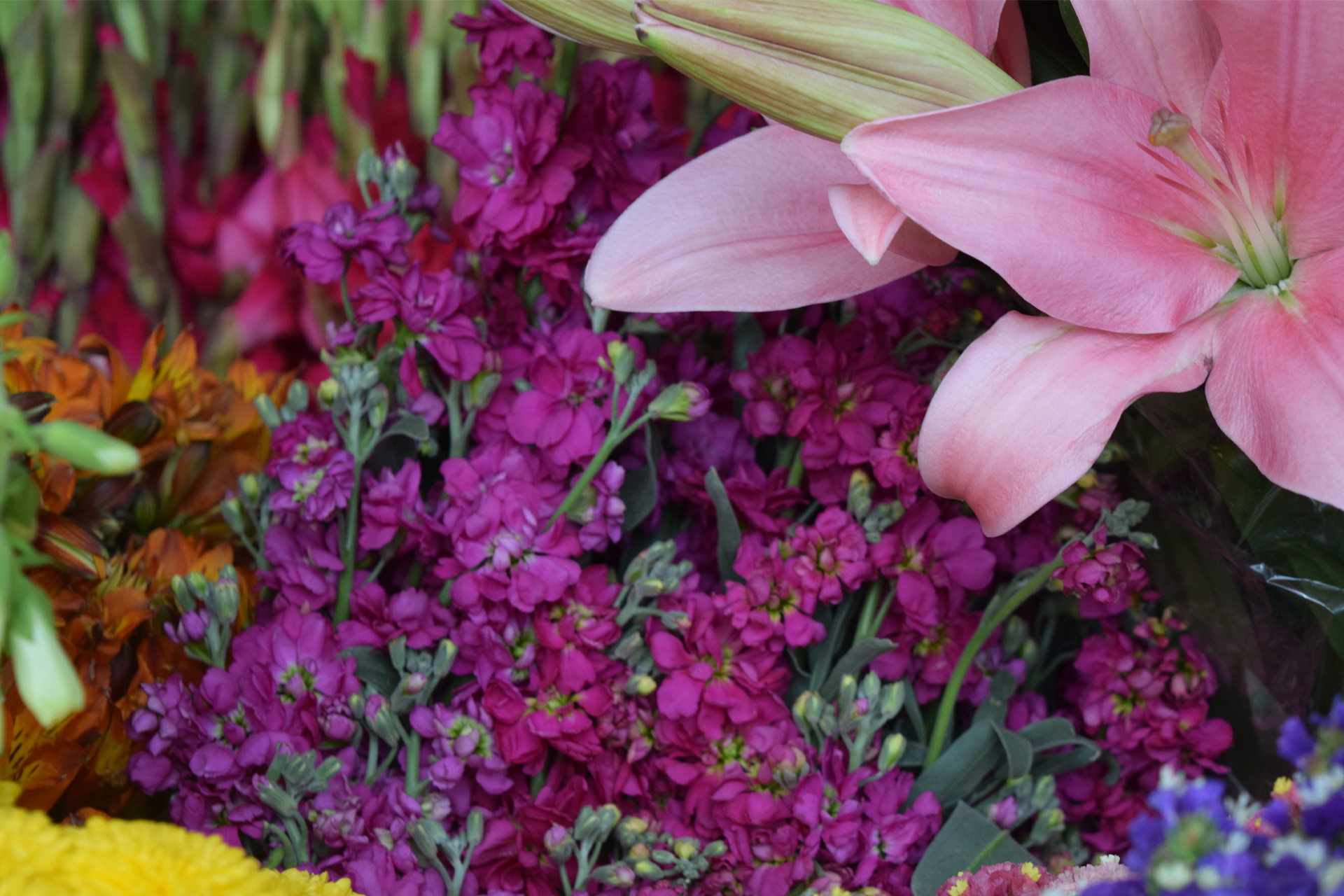 Diseño floral con girasoles, rosas, flores aromáticas, acapulco y follajes diversos.